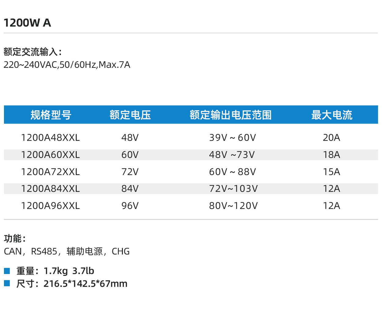 1200W A 密封设计 便携式/ Onboard 适用于电动踏板车、电摩、ATV/UTV、高尔夫球车、割草机、AGV、叉车、电动冲浪板、电动船的铅酸电池、锂电池、镍氢电池、镍镉电池等电池组循环充电或浮充电 联系我们 产品特性 安全性 有源PFC和LLC等技术的应用 可靠的硬件及电压、电流自检保护 完善的充电策略确保充电过程高度安全 可靠性 外壳结构采用一体化压铸技术 机器内部采用灌胶工艺可导热、防震、抗老化 经多年的行业验证,充电机可适应恶劣的工业使用环境。(高湿、高热、震动、多尘) 功能 CAN 通讯. 辅助电源 技术参数 保护功能 过热保护 当充电机内部温度超过内部设定值时,充电电流自动减小; 环境温度超过65℃,充电机关机保护;温度恢复时,自动恢复充电 电池反接保护 电池接反时充电机内部电路与电池断开,不会损坏充电机 空载保护 不接电池时无输出 短路保护 输出短路时充电机内部电路与电池断开,只有当故障排除后重新接入电池才可恢复充电 充满自动关机 充满后自动关机 文章导航 Previous Product840W A Next Product1350W/1500W A