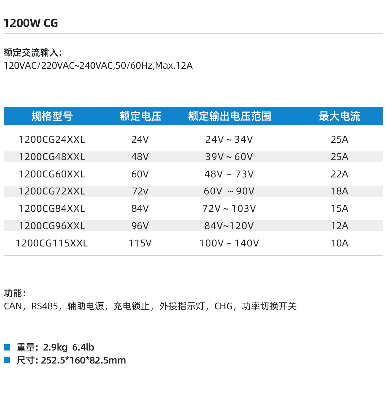 1200W CG 密封设计 便携式/ Onboard 适用于电动踏板车、电摩、ATV/UTV、高尔夫球车、割草机、AGV、叉车、电动冲浪板、电动船的铅酸电池、锂电池、镍氢电池、镍镉电池等电池组循环充电或浮充电 联系我们 产品特性 安全性 有源PFC和LLC等技术的应用 可靠的硬件及电压、电流自检保护 完善的充电策略确保充电过程高度安全 满足UL/CB/CE/KC/RCM/FCC/CEC/DOE/CA65认证指令要求 可靠性 外壳结构采用一体化压铸技术 机器内部采用灌胶工艺可导热、防震、抗老化 经多年的行业验证,充电机可适应恶劣的工业使用环境。(高湿、高热、震动、多尘) 功能 CAN 通讯. 辅助电源 充电锁止 外接指示灯 技术参数 保护功能 过热保护 当充电机内部温度超过内部设定值时,充电电流自动减小; 环境温度超过65℃,充电机关机保护;温度恢复时,自动恢复充电 电池反接保护 电池接反时充电机内部电路与电池断开,不会损坏充电机 空载保护 不接电池时无输出 短路保护 输出短路时充电机内部电路与电池断开,只有当故障排除后重新接入电池才可恢复充电 充满自动关机 充满后自动关机 文章导航 Previous Product840W CG Next Product1500W CG