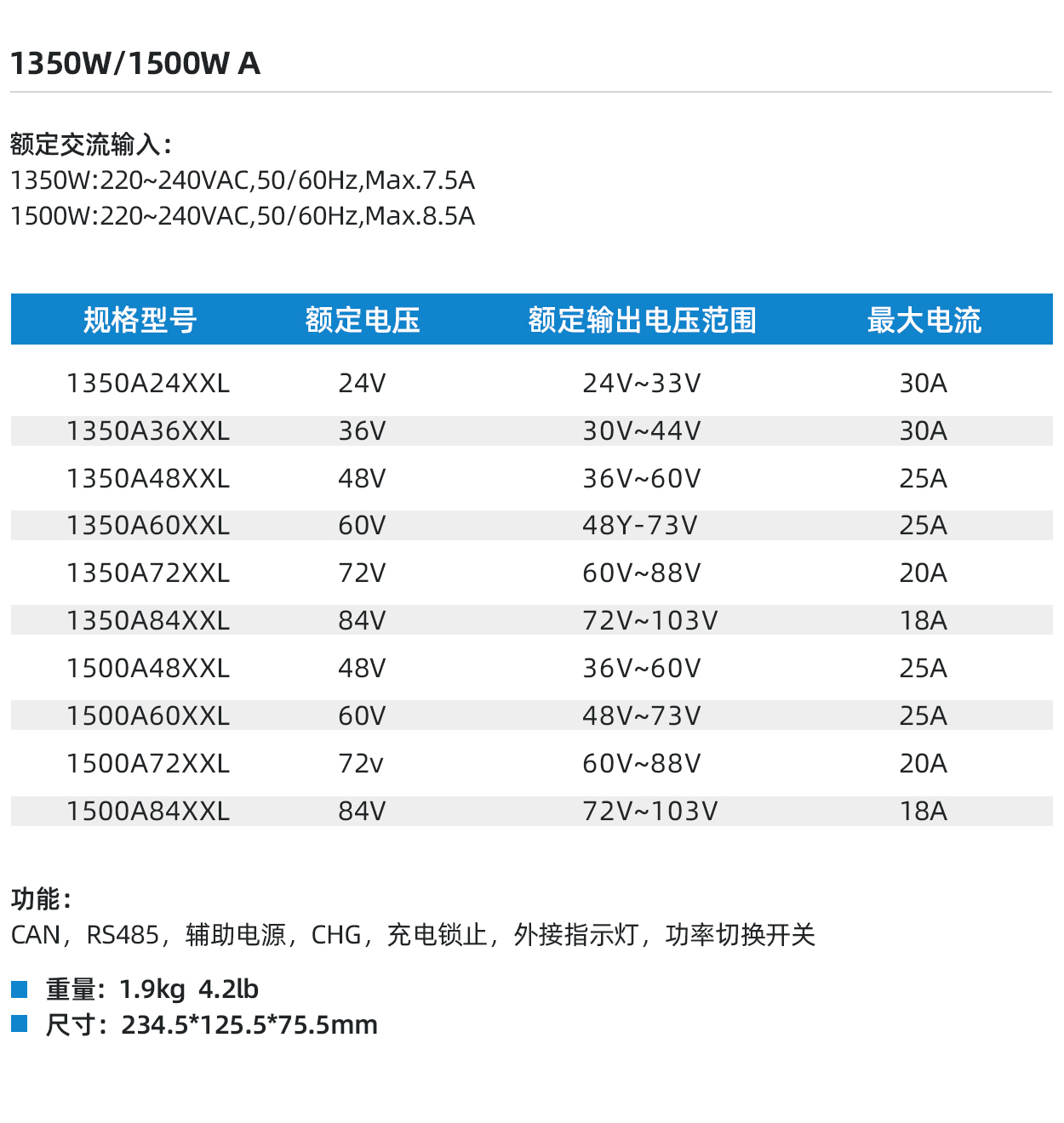 1350W/1500W A 密封设计 便携式/ Onboard 适用于电动踏板车、电摩、ATV/UTV、高尔夫球车、割草机、AGV、叉车、电动冲浪板、电动船的铅酸电池、锂电池、镍氢电池、镍镉电池等电池组循环充电或浮充电 联系我们 产品特性 安全性 有源PFC和LLC等技术的应用 可靠的硬件及电压、电流自检保护 完善的充电策略确保充电过程高度安全 可靠性 外壳结构采用一体化压铸技术 机器内部采用灌胶工艺可导热、防震、抗老化 经多年的行业验证,充电机可适应恶劣的工业使用环境。(高湿、高热、震动、多尘) 功能 CAN 通讯. 辅助电源 充电锁止 外接指示灯 技术参数 保护功能 过热保护 当充电机内部温度超过内部设定值时,充电电流自动减小; 环境温度超过65℃,充电机关机保护;温度恢复时,自动恢复充电 电池反接保护 电池接反时充电机内部电路与电池断开,不会损坏充电机 空载保护 不接电池时无输出 短路保护 输出短路时充电机内部电路与电池断开,只有当故障排除后重新接入电池才可恢复充电 充满自动关机 充满后自动关机 文章导航 Previous Product1200W A Next Product1500W HA