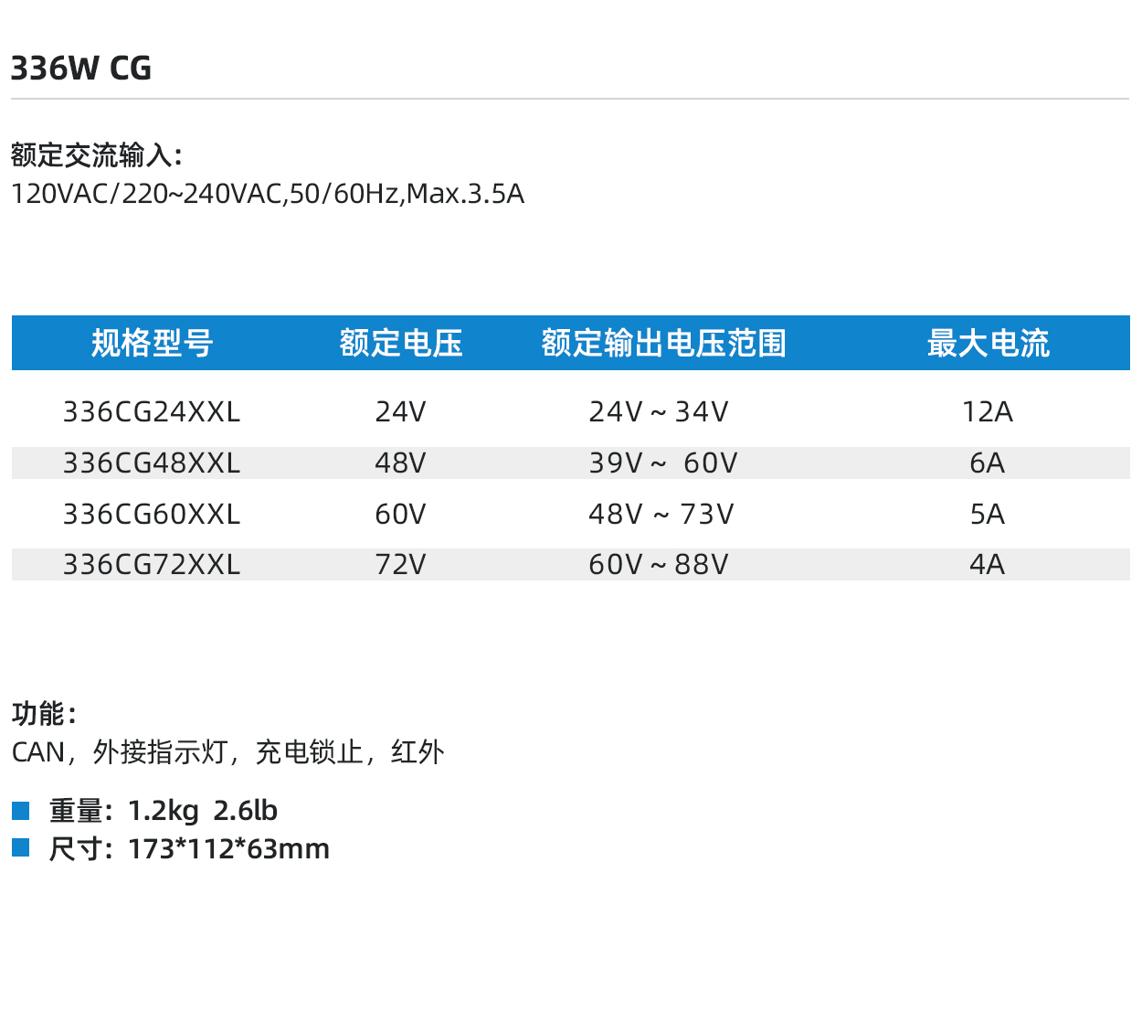 336W CG 密封设计 便携式/ Onboard 适用于电动踏板车、电摩、ATV/UTV、高尔夫球车、割草机、AGV、叉车、电动冲浪板、电动船的铅酸电池、锂电池、镍氢电池、镍镉电池等电池组循环充电或浮充电 联系我们 产品特性 安全性 有源PFC和LLC等技术的应用 可靠的硬件及电压、电流自检保护 完善的充电策略确保充电过程高度安全 满足UL/CB/CE/KC/RCM/FCC/CEC/DOE/CA65认证指令要求 可靠性 外壳结构采用一体化压铸技术 机器内部采用灌胶工艺可导热、防震、抗老化 经多年的行业验证,充电机可适应恶劣的工业使用环境。(高湿、高热、震动、多尘) 功能 CAN 通讯. 辅助电源 充电锁止 技术参数 保护功能 过热保护 当充电机内部温度超过内部设定值时,充电电流自动减小; 环境温度超过65℃,充电机关机保护;温度恢复时,自动恢复充电 电池反接保护 电池接反时充电机内部电路与电池断开,不会损坏充电机 空载保护 不接电池时无输出 短路保护 输出短路时充电机内部电路与电池断开,只有当故障排除后重新接入电池才可恢复充电 充满自动关机 充满后自动关机 文章导航 Previous Product6000W BG Next Product600W CG