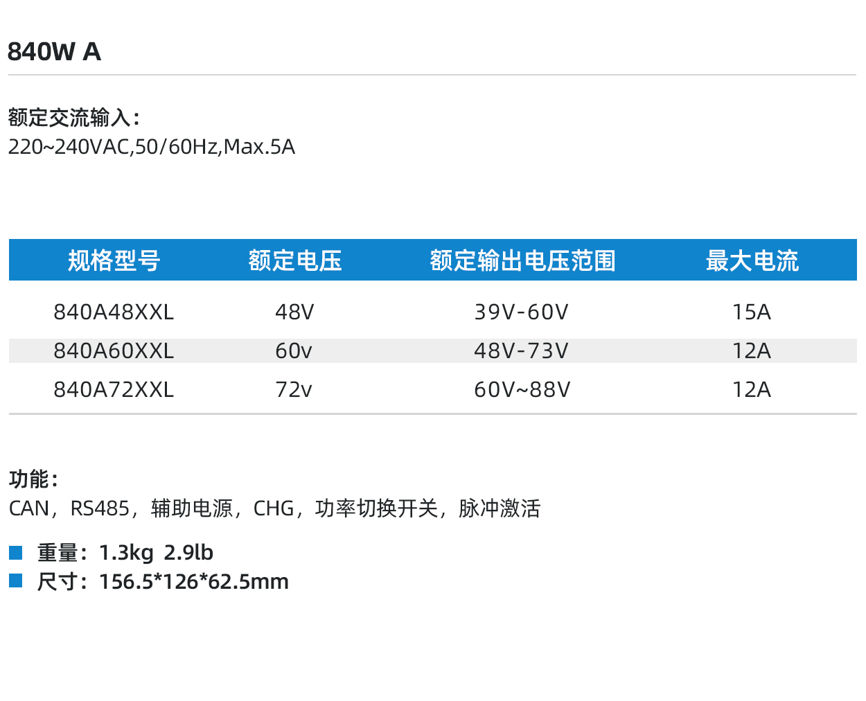 840W A 密封设计 便携式/ Onboard 适用于电动踏板车、电摩、ATV/UTV、高尔夫球车、割草机、AGV、叉车、电动冲浪板、电动船的铅酸电池、锂电池、镍氢电池、镍镉电池等电池组循环充电或浮充电 联系我们 产品特性 安全性 有源PFC和LLC等技术的应用 可靠的硬件及电压、电流自检保护 完善的充电策略确保充电过程高度安全 可靠性 外壳结构采用一体化压铸技术 机器内部采用灌胶工艺可导热、防震、抗老化 经多年的行业验证,充电机可适应恶劣的工业使用环境。(高湿、高热、震动、多尘) 功能 CAN 通讯. 辅助电源 技术参数 保护功能 过热保护 当充电机内部温度超过内部设定值时,充电电流自动减小; 环境温度超过65℃,充电机关机保护;温度恢复时,自动恢复充电 电池反接保护 电池接反时充电机内部电路与电池断开,不会损坏充电机 空载保护 不接电池时无输出 短路保护 输出短路时充电机内部电路与电池断开,只有当故障排除后重新接入电池才可恢复充电 充满自动关机 充满后自动关机 文章导航 Previous Product750W/900W A Next Product1200W A
